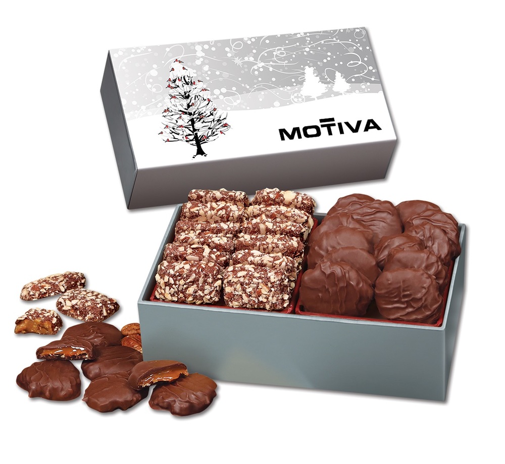 sku: 1038The perfect gift for the chocolate lovers on your list. Rich, mouthwatering Pecan Turtles made with creamy caramel, full-flavored Southern pecans, and premium chocolate come packed with our signature English Butter Toffee. Our toffee is made the old-fashioned way with plenty of dairy-fresh Wisconsin butter for a flavor that’s almost impossible to find anymore. The silver gift box comes wrapped with your choice of holiday sleeves and contains eleven-ounces of the best chocolate ever! The sleeve features your imprint in one of four colors.
